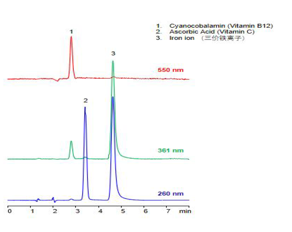 App ID: FLM-C250009 Comixsil HAX 對保健品配方中維生素C、維生素B12 以及硫酸亞鐵的HPLC-UV 法測定 色譜柱:Comixsil HAX 3u 150*2.1mm (貨號:FMF-HAX3-BONU) 方法:100ml 乙腈+600ml 水+300ml 100mM 甲酸銨(pH4.1) 流速:0.2 mL/min 檢測:260nm、360nm 和550nm 樣品濃度:維生素B12 0.005 mg/mL、維生素C 0.1mg/mL、三價鐵離子0.05mg/mL、EDTA 0.15mg/mL 進樣量:1 μL